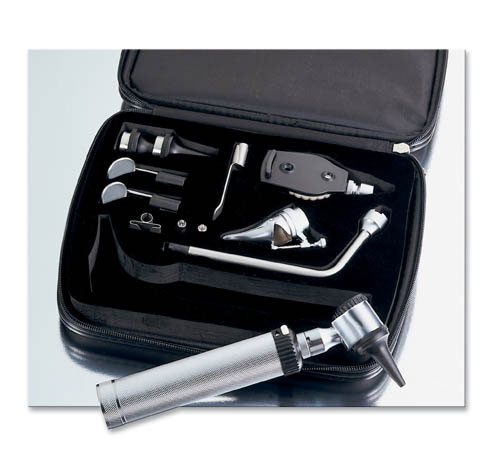 Complete Set Features: Bayonet locking mounts for each instrument head to allow secure connection to the battery handle * C cell powered satin finish chrome-plated battery handle with knurled finish * Rheostatic on/off switch * Complete in zippered case with fitted foam insert that is scuff and scratch resistant and cleans easily * Weighs 23 1/2 oz * Inspected and packaged in the U.S.A. from foreign components * Batteries NOT included * Otoscope: Chrome-plated Otoscope head with removable 4x magnifying lens and insufflator fitting * Auto-clavable polypropylene ear specula in 2.5mm 3.5mm and 4.5mm sizes * Adapter to allow use with Welch Allyn or compatible disposable specula * Nasal speculum adapter with manual screw opening for instrumentation connects to the otoscope head Ophthalmoscope: * Ophthalmoscope * head with lens wheel featuring 25 corrective lenses from -25 to +40 diopters Bent Arm Illuminator: Chrome-plated bent arm larynx and nasopharynx illuminator for lighting the oral cavity and pharyngeal area * One 3.0mm and one 4.0mm mirror with integral tongue depressor holder that attaches to the illuminator * One tongue depressor attachment for the illuminator * One disposable tongue depressor adapter for the illuminator *