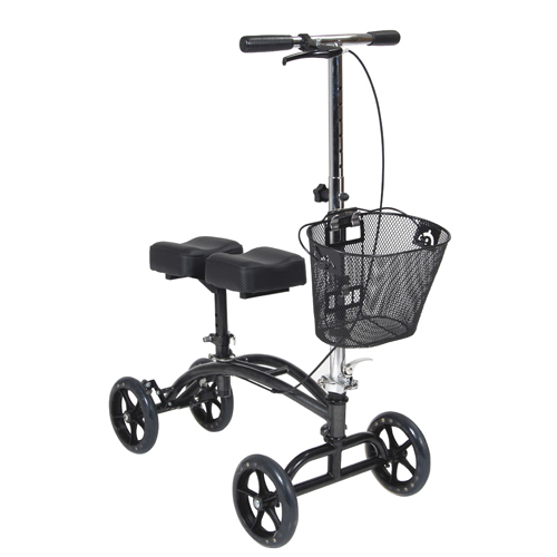 Knee walker can be steered for increased maneuverability Ideal for individuals recovering from foot surgery breaks sprains amputation and ulcers of the foot New two-piece padded leg pad provides comfort Deluxe braking system Removable front basket Durable steel frame with silver vein finish Tool free height adjustment 7 casters are ideal for indoor/outdoor use