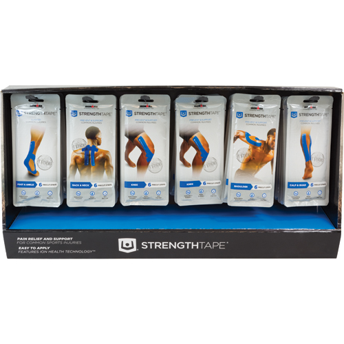 StrengthTape retail POP display with 36 precut kit assortment (includes 6 ankle/foot 6 back/neck 12 knee 6 shoulder 6 calf/quad). StrengthTape provides support & stability for muscles joints and tendons without limiting range of motion like a traditional brace. Featuring AllSport adhesive StrengthTape can be worn for up to 5 days in nearly any condition including water. Great for shin splints back pain ankle sprain shoulder pain and other applications. Breathable cotton fabric. 10% more stretch. Support stability & compression. 5 -7 days wear time and can get wet. Infused with IonTech minerals in tape that emit ions. Easy-to-follow instructions.