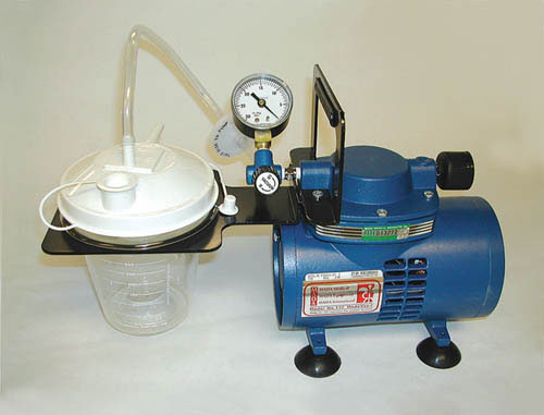 Aspirator pump on blue base stand with carry handle * Adjustable suction from 0-22 Hg * Disposable collection jar has 800cc capacity * Overflow cutoff and hydrophobic filter to protect the aspirator pump 115V/60mHz/2.9 A* Shipping Carton Size: 18 L x 14 W x 12 H